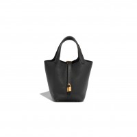 This Picotin Lock is in Rose Texas clemence leather with palladium hardware and has tonal stitching with two top handles. The interior is lined with Rose Texas natural leather, no interior pockets and has a pull through closure secured by padlock.
